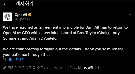 오픈 AI는 22일(현지시간) 공식 X(트위터) 채널을 통해 "샘 올트먼 최고경영자(CEO), 브렛 테일러 이사회 의장, 래리 서머스, 아담 디앤젤로의 등 신규 이사회 멤버들이 복귀하는데 원칙적으로 합의했다"라고 밝혔다.