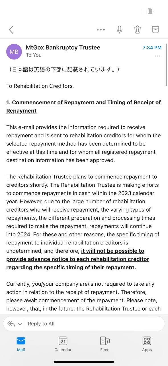 파산한 가상자산(암호화폐) 거래소 마운트곡스(MtGox) 채권자들이 파산 관재인들로부터 현금 상환 개시 관련 이메일을 받은 것으로 나타났다.