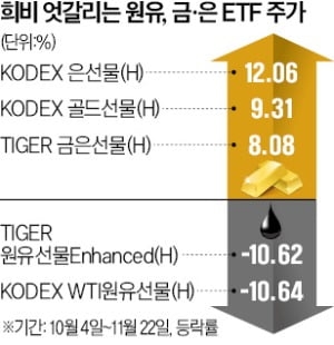 이스라엘과 하마스 간 전쟁 발발 후 주가가 동반 상승한 원유와 금값이 엇갈리면서 관련 상장지수펀드(ETF)의 희비도 갈리고 있다.