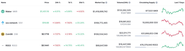 지갑 주소 '0xB4aE'는 최근 144만달러 상당의 RSS3 1000만개를 OKX거래소에서 인출했고 '0xb6a7'은 바이낸스에서 약 193만달러의 SSV 11만4227개를 자신의 지갑으로 전송했다. 특히 '0x9e74'의 경우 지난 7월부터 바이낸스에서 MKR를 지속적으로 구매했으며 총 가치는 690만달러에 이른다.