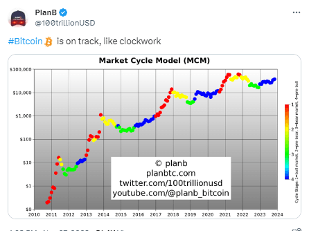 유명 가상자산(암호화폐) 분석가인 플랜비(PlanB)가 27일(현지시간) X(구 트위터)를 통해 "비트코인(BTC)은 시장 주기 모델(Market Cycle Model)을 따라 순항하고 있다"고 밝혔다.