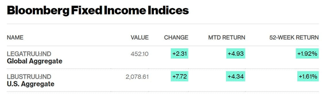 블룸버그 미국 총채권 지수는 이달 들어 29일(현지시간)까지 약 4.3% 상승했다. 1985년 이후 월간 최고 상승률이다. FT는 "블룸버그 미국 총채권 지수는 11월의 랠리로 올해 총 수익률이 플러스 영역에 진입함에 따라 '47년 만에 전례 없는 3년 연속 손실을 피할 수 있을 것'이라는 기대감이 커지고 있다"고 전했다.