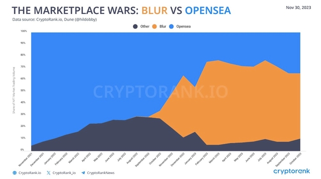 30일 가상자산(암호화폐) 분석 플랫폼 크립토랭크(CryptoRank)는 엑스(옛 트위터)를 통해 "오픈씨의 시장 점유율은 재작년 11월 95%에서 이날 34.3%를 기록하며 급감했다"면서 "현재 블러의 시장 점유율은 66.5%까지 급상승했다"라고 전했다.