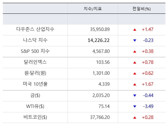 나스닥 지수가 1% 내린 가운데 이날 주요 기술주는 대체로 하락했다. 애플 +0.27%%과 마이크로소프트 +0.05%는 강보합 마감했다. 아마존 -0.07%, 알파벳 -1.87%, 메타 -1.99%, 넷플릭스 -0.50%, 엔비디아 -3.16% 를 기록했다.
