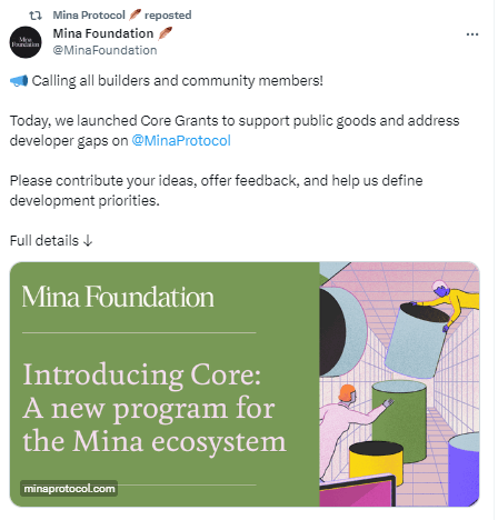 미나(MINA) 재단, 생태계 보조금 프로그램 코어(Core) 출시입력 오전 11:08 · 2023. 12. 04.기사출처김정호 기자00공유하기링크 복사텔레그램엑스카카오톡미나(MINA) 재단이 4일(현지시간) 공식 X(구 트위터)를 통해 "생태계 보조금 프로그램 코어(Core)를 출시했다"고 전했다.MINA김정호 기자reporter1@bloomingbit.io안녕하세요 블루밍비트 기자입니다.
