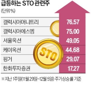 STO 발행업에 진출한 갤럭시아머니트리는 5일 4.23% 올랐다. 지난 1주일(11월 29일~12월 5일) 상승률이 76.57%에 달했다. 갤럭시아머니트리 지분 54%를 보유한 갤럭시아에스엠도 최근 한 주 동안 75% 뛰었다.