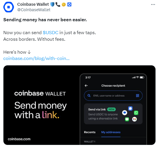 글로벌 가상자산(암호화폐) 거래소 코인베이스의 자체 개발된 가상자산 월렛 코인베이스 월렛이 5일(현지시간) 공식 X(구 트위터)를 통해 "USD코인(USDC) 무료 송금 서비스를 출시했다"고 전했다.