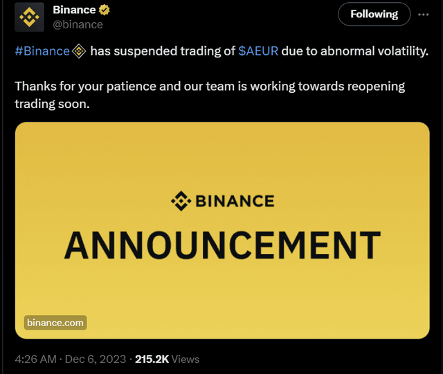 결국 바이낸스는 이날 "비정상적인 변동성을 감지해 AEUR 현물 거래를 일시 중단한다"고 밝혔다. 이번 결정으로 AEUR-USDT뿐만 아니라 BTC-AEUR, ETH-AEUR, EUR-AEUR 등의 거래페어가 일시 중단된다. 다만, 바이낸스에서 AEUR 입출금 서비스는 계속 이용할 수 있다.