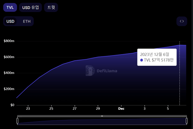 지난 6일(현지시간) 디파이라마(DeFi Llama) 데이터에 따르면 블래스트의 총 락업 예치금(TVL)은 7억5000만 달러를 돌파했다. 이는 5억 달러를 돌파한 지 열흘 만이다.