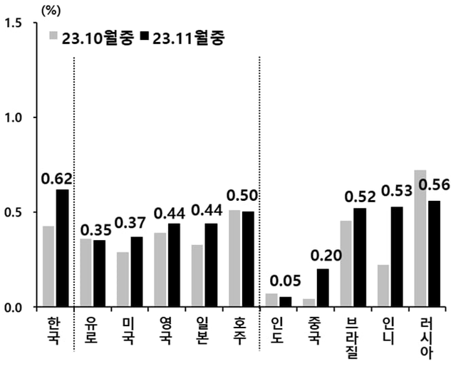 미국은 이 기간 연 4.93%에서 연 4.23%로 0.7%포인트 하락했다. 일본(-0.18%포인트), 독일(-0.53%포인트), 영국(-0.47%포인트) 등도 한국보다 낙폭이 적었다. 신흥국 중에서도 브라질(-0.93%포인트), 멕시코(-0.89%포인트), 튀르키예(-2.19%포인트) 등을 제외하면 한국보다 10년물 금리가 더 하락한 곳은 없었다.