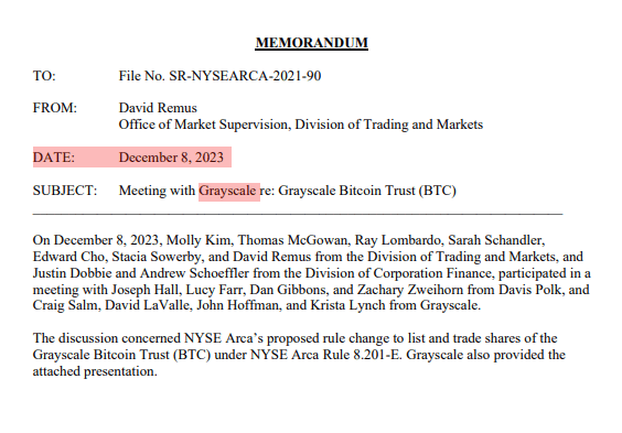 12일(현지시간) 제임스 세이파트(James Seyffart) 블룸버그 애널리스트는 자신의 X(옛 트위터)에 "최근 블랙록, 그레이스케일, 프랭클린, 피델리티와 SEC가 비트코인 현물 ETF 관련 미팅을 가졌다. 이 자리에 SEC의 트레이딩 및 마켓 부서와 기업 금융 부서 담당자가 모두 참석했다"고 전했다.