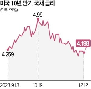지난 10월 장중 연 5%를 돌파했던 10년 만기 미 국채 금리는 12일엔 연 4.198%까지 떨어졌다. 지난달 한 달 동안에만 0.65%포인트 하락했다. 블룸버그에 따르면 11월은 1980년대 이후 채권 투자가 가장 호실적을 낸 달이다.