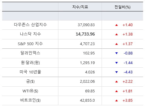 13일(미국 동부 시각) 뉴욕증권거래소(NYSE)에서 다우존스30산업평균지수는 전장보다 512.89포인트(1.40%) 오른 37,090.83 을 기록했다. S&P500 지수는 전장보다 63.53포인트(1.37%) 오른 4,707.23, 나스닥 지수는 200.57포인트(1.38%) 오른 14,733.96을 가리켰다.