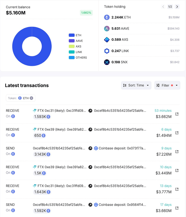 이어 "FTX는 1593개의 이더리움을 또다른 지갑 주소로 전송시켰다. 해당 주소는 2244개의 이더리움을 보유하고 있다"면서 "아마 곧 코인베이스로 이더리움을 이체할 것으로 보인다"고 덧붙였다.