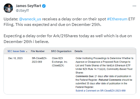 제임스 세이파트(James Seyffart) 블룸버그 애널리스트가 18일(현지시간) X(구 트위터)를 통해 "미국 증권거래위원회(SEC)가 반에크의 이더리움(ETH) 상장지수펀드(ETF) 승인 결정을 연기했다"고 전했다.