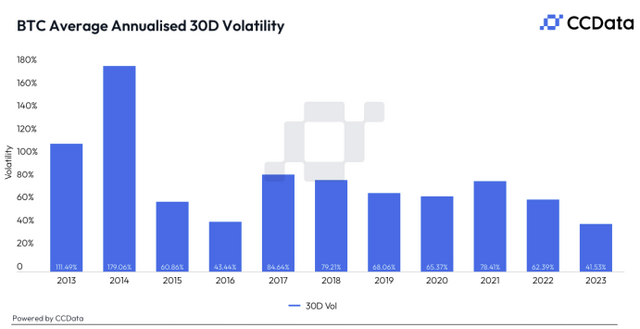 지난 14일(현지시간), 암호화폐 전문 리서치 업체 CC데이터의 보고서에 따르면 2023년 비트코인 연평균 30일 변동성은 41.53%로, 역대 최저치였다. 이에 대해 보고서는 "비트코인이 제도화 시기에 접어들면서 자산 등급이 한층 더 성숙하었음을 나타낼 수 있다"고 분석했다.