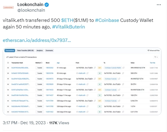 앞서 비탈릭 부테린으로 추정되는 주소가 500ETH(110만달러 규모)를 코인베이스 프라임으로 입금한 것으로 알려진 바 있다.