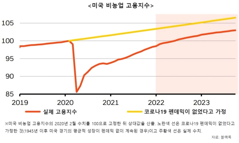 블랙록은 "지난해 이후를 보면 일자리가 많이 늘어나는 것 같지만, 보다 기간을 늘려 2019년 이후를 보면 이제 막 펜데믹의 충격에서 빠져나온 수준"이라고 강조했다. 실제로 블랙록이 2020년 미국 비농업 고용지수를 100으로 환산하고 그에 맞춰 다른 기간의 수치를 조정해 도표에 나타낸 자료를 보면, 현재 미국 고용은 정상적인 성장 경로에 한참 못 미친다.