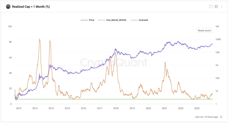 주기영 대표는 20일 자신의 X(트위터)를 통해 "1개월 미만 비트코인 홀더들의 비율이 아직 한자리수대에 머무르고 있다"라며 "이 지표를 고려한다면 비트코인 가격이 아직 고점이 아님을 알 수 있다"라고 설명했다.