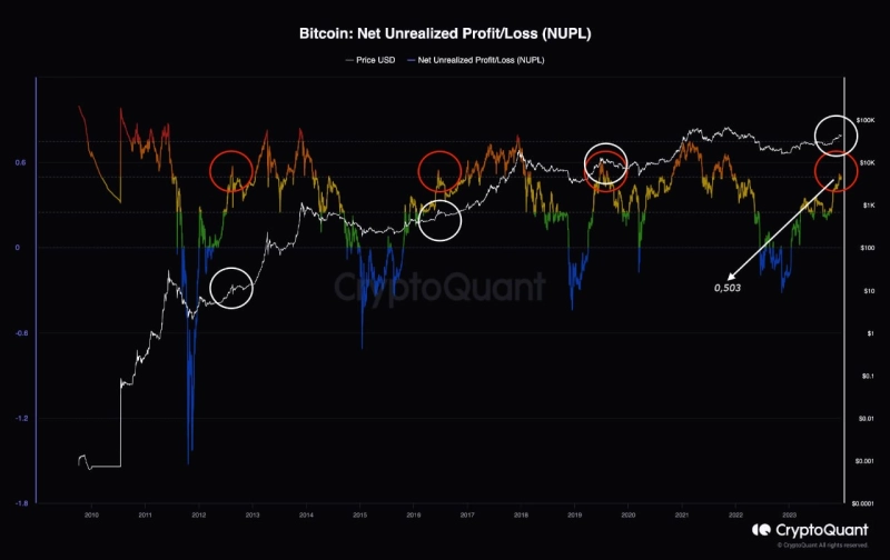 22일 온체인 분석 플랫폼 크립토퀀트의 기고가 'tugbachain'은 "순미실현손익(NUPL)의 현재 레벨은 0.503으로 반감기 전 기간동안 투자자들은 0.50\~0.55 사이에서 수익화를 진행했다"면서 조정 발생 가능성을 예측했다.