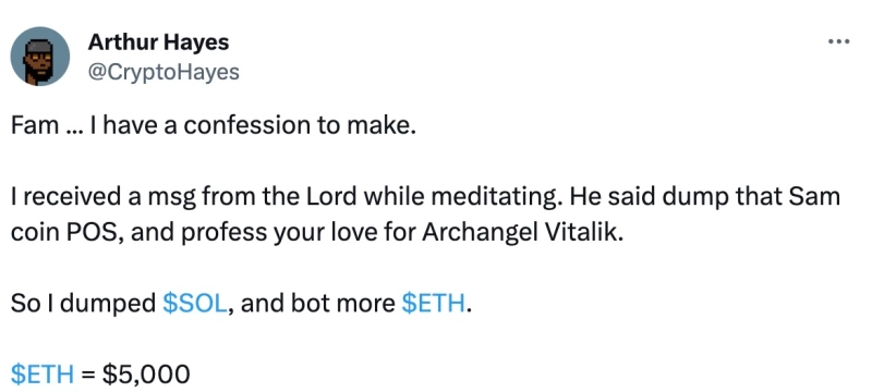 21일(현지시간) 헤이즈는 자신의 X(옛 트위터)를 통해 "명상 도중 주님으로부터 샘 알트먼 코인을 팔고 비탈릭 부테린에 대한 너의 사랑을 고백하라는 계시를 받았다"면서 "그래서 솔라나(SOL)를 팔고 이더리움(ETH)을 샀다"고 말했다. 그러면서 이더리움이 추후 5000달러까지 오를 것이라고 주장했다.