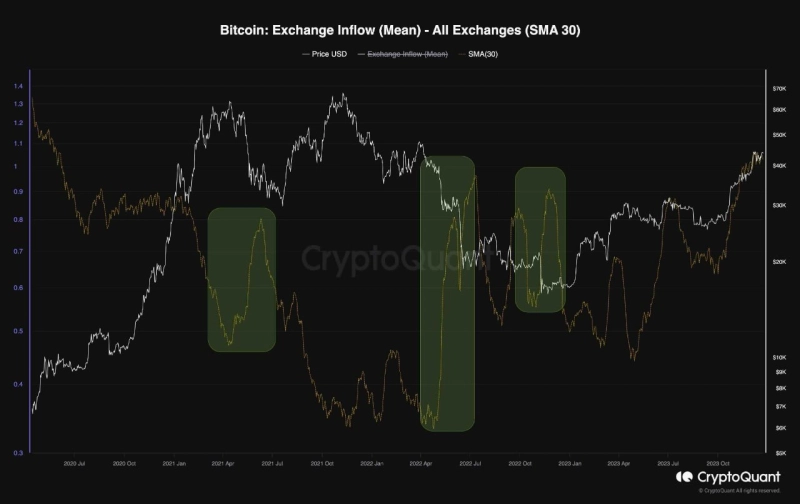 비트코인(BTC)의 30일 평균 거래소 입금량이 증가하면서 가격 조정이 발생할 수 있다는 분석이 나왔다.