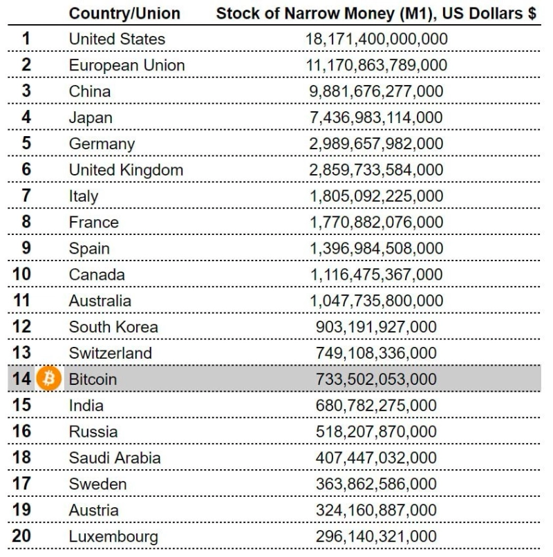 비트코인(BTC)의 시가총액이 글로벌 통화 유통량 상위 15위권에 진입했다.