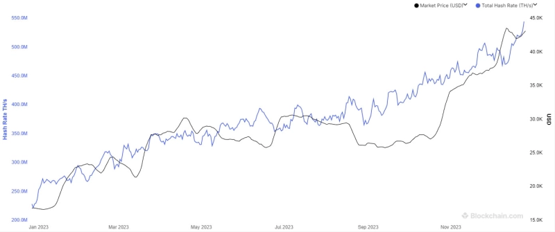 26일(현지시간) 코인텔레그래프는 블록체인닷컴 데이터를 인용해 "비트코인 해시레이트는 25일 기준 초당 544엑사해시(EH/s)로 사상 최고치를 기록했다"라고 보도했다.