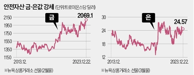 지난 22일 뉴욕상품거래소(NYMEX)에 따르면 이날 금 선물 근월물은 전주보다 약 1.6% 오른 트로이온스당 2069.1달러로 거래를 마쳤다. 금값은 러시아의 우크라이나 침공에 이어 이스라엘과 팔레스타인 하마스 간 전쟁 발발 등 지정학적 불안으로 상승세를 보이며 3일 장중 트로이온스당 2136.36달러로 최고점을 찍었다. 잠시 숨 고르기를 하던 금값은 13일 제롬 파월 Fed 의장이 금리 인하 시기를 고민해야 할 상황이라는 발언을 내놓자 다시 오름세를 탔다. Fed가 공개한 점도표상 내년 말 예상 금리 수준에 따르면 미국 기준금리는 내년 1.5%포인트 하락할 전망이다.