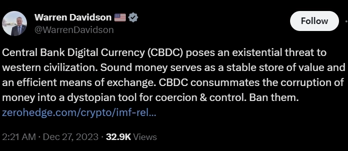 27일(현지시간) 데이비슨 의원은 자신의 X(옛 트위터)를 통해 "CBDC는 서구 문명에 실존적 위협"이라며 "CBDC는 강압과 통제를 위한 도구로 변질될 수 있어 전면 금지해야 한다"고 주장했다.