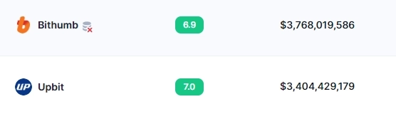 27일 가상자산 데이터 플랫폼 코인마켓캡(Coinmarketcap)의 현물 거래량 데이터에 따르면 빗썸의 24시간 거래량은 37억6801만달러, 업비트의 거래량은 34억442만달러를 기록하고 있다.