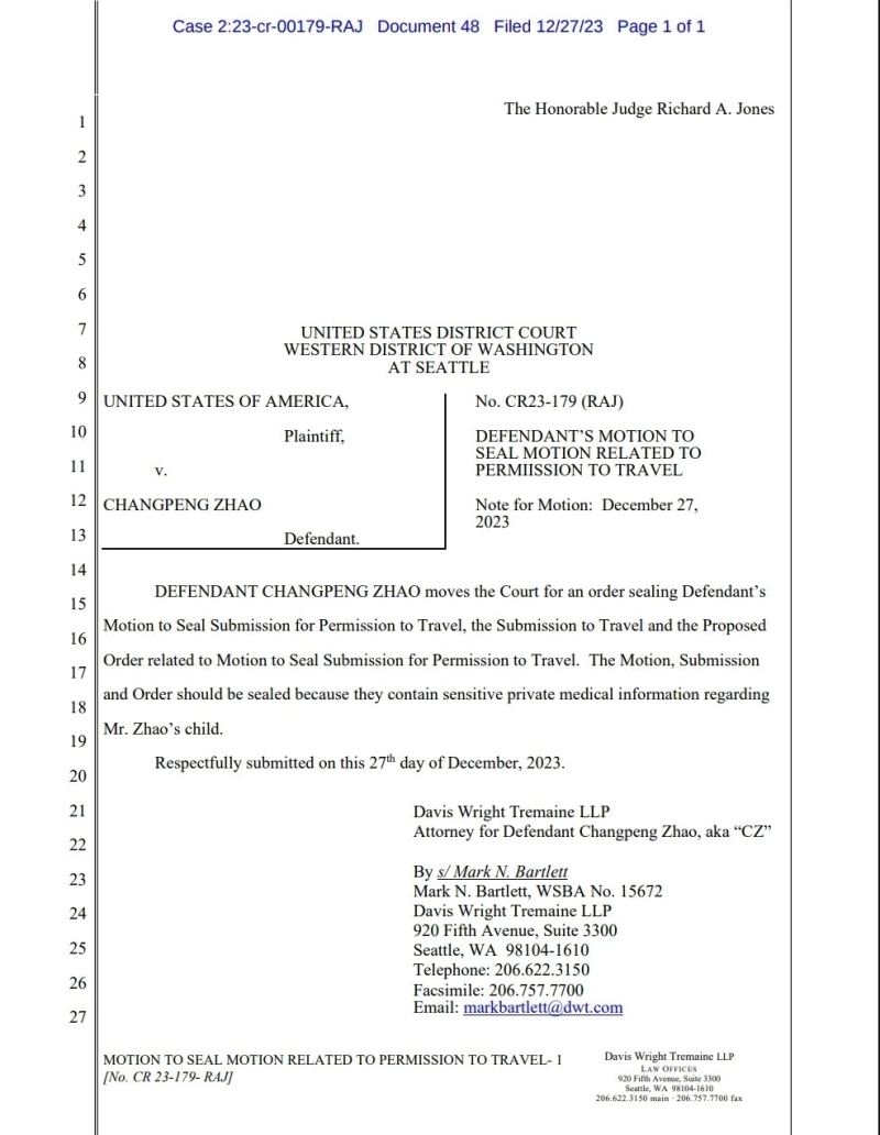 27일(현지시간) 코인데스크에 따르면 CZ는 미국 바깥으로의 여행을 허가해달라는 내용을 담은 신청서를 제출하고 해당 서류를 봉인해줄 것을 요청했다.