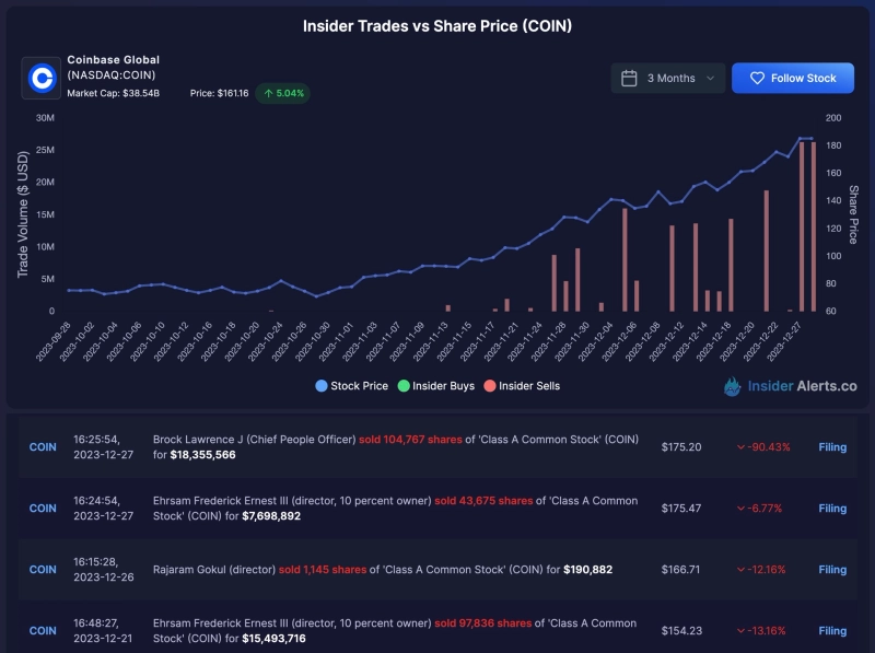 글로벌 가상자산(암호화폐) 거래소 코인베이스 임원진들이 약 25만주의 자사주를 매각한 것으로 나타났다.