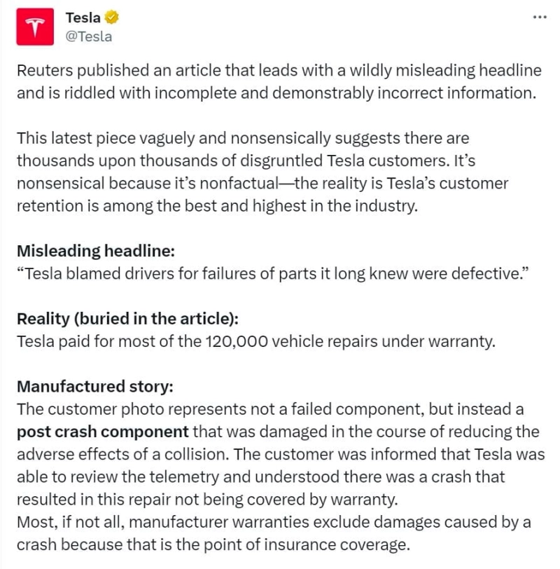 이에 대해 테슬라는 X(트위터)를 통해 "로이터의 보도는 매우 오해가 있는 헤드라인과 불완전하면서 명백히 잘못된 정보로 가득차 있다"고 반박했다. 테슬라는 오랫동안 결함이 있던 것으로 알고 있던 부품을 운전자 탓으로 돌린 것에 대해 "보증기간 12만건 수리비 대부분 지불했다"고 해명했다.