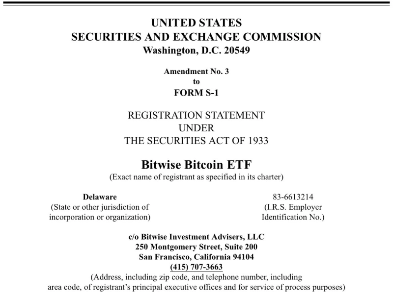 비트와이즈가 현물 비트코인(BTC) 상장지수펀드(ETF) 신청서의 3번쨰 수정안을 제출했다.
