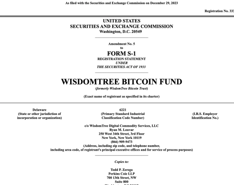 위즈덤트리가 현물 비트코인(BTC) 상장지수펀드(ETF) 신청서의 5차 수정안을 제출했다.
