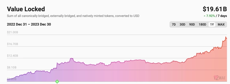 30일 L2비트의 데이터에 따르면 현재 이더리움 L2에 예치된 총 자산의 규모는 196억1000만달러로 전주 대비 7.92% 올랐다.