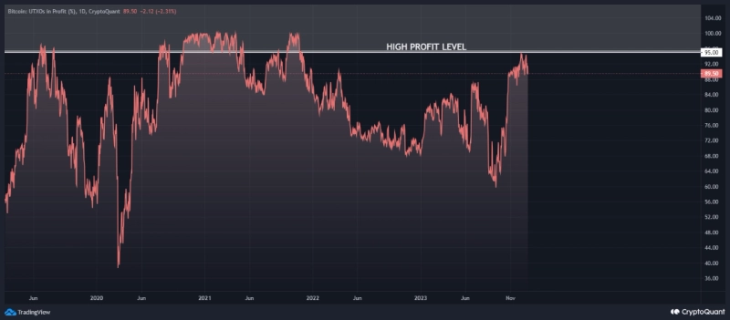 30일 가상자산(암호화폐) 분석 플랫폼 크립토퀀트(CryptoQuant)의 시모나디(SimonaD) 분석가는 퀵테이크 리포트를 통해 "지난 2021년 강세장의 고점(약 6만7000달러) 당시 수익 중인 UTXO 비율은 95%였다"면서 "과거 데이터와 유사한 경우 비트코인은 다음 상승에서 고점을 터치하고 (시세가)반전될 수 있을 것"이라고 전망했다.