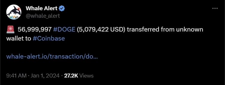 1일(현지시간) 가상자산 트랜잭션 추적 사이트 웨일얼럿은 공식 X(옛 트위터)에 "5699만9997 DOGE가 익명의 지갑에서 코인베이스로 이체됐다"고 전했다. 이체된 도지코인은 507만9422달러 규모인 것으로 파악된다.