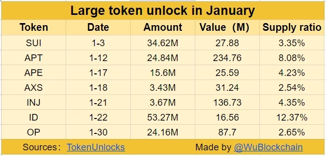 1일(현지시간) 우블록체인은 토큰언락 데이터를 인용해 "오는 1월 수이, 앱토스, 엑시 인피니티(AXS), 인젝티브(INJ), 에이프(API), 옵티미즘(OP) 등 다수 가상자산이 대규모 토큰 언락을 앞두고 있으며, 총 언락 물량의 가치는 5억6000만달러에 달한다"라고 전했다.