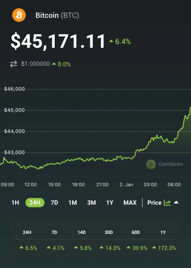 비트코인 가격은 이날 지난 2022년 4월 5일 이후 처음으로 4만5000달러를 돌파했다. 오전 11시 14분 현재 바이낸스 USDT마켓 기준 비트코인은 24시간 전 대비 5.76% 상승한 4만5009달러에 거래되고 있다. 글로벌 가상자산 시가총액은 약 1조8000억달러 선을 회복했다.