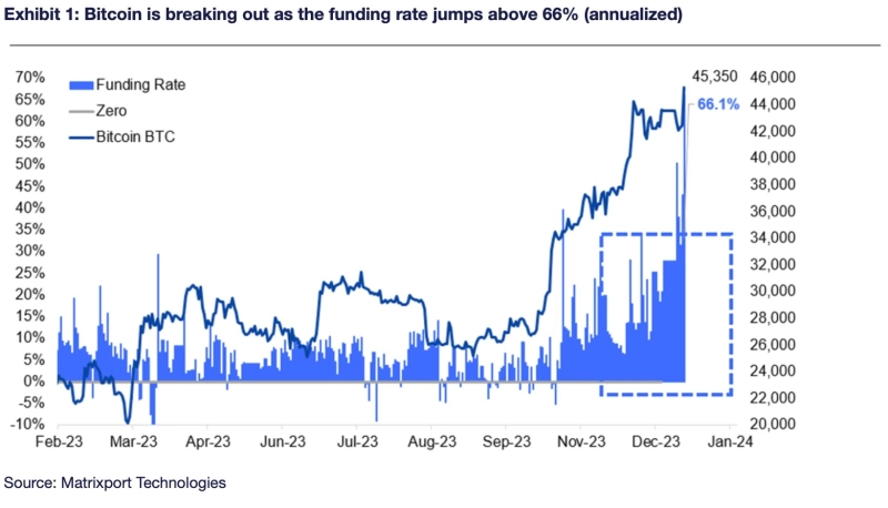 2일(현지시간) 가상자산(암호화폐) 서비스 제공업체 매트릭스포트는 공식 X(옛 트위터)를 통해 "현물 ETF 승인과 기관 매수, 공급 부족, 과거 추세 등을 비춰볼 때, 1월에 비트코인은 5만달러까지 급등할 것"이라고 평가했다.