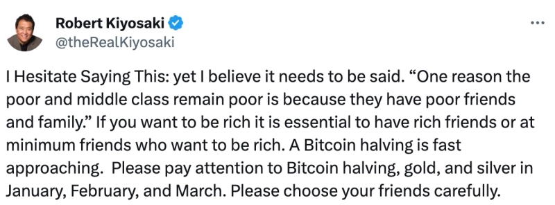 이어 "비트코인 반감기가 빠르게 다가온다. 1\~3월에는 금, 은, 비트코인을 지켜봐야한다"면서 "친구를 신중하게 선택해라"고 덧붙였다.