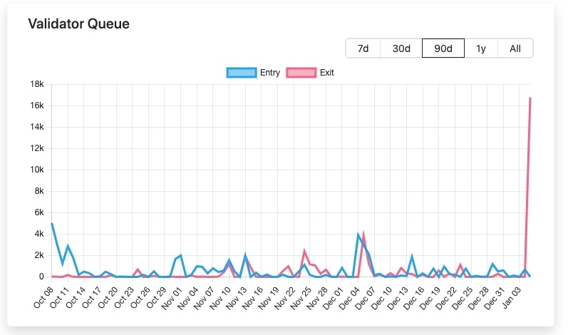 5일 이더리움 스테이킹 데이터를 추적하는 이더리움 밸리데이터 큐에 따르면 이날 15시 53분 현재 1만6399명의 검증자가 이더리움 스테이킹 서비스에서 빠져나가기 위해 출금을 신청했다. 출금 대기열에 합류한 인원은 이날 사상 최고치를 기록했고 이더리움을 실제 출금하기까지는 5일 12시간이 걸릴 것으로 추정된다.