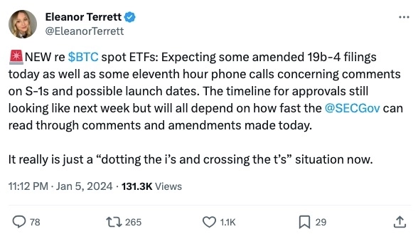 5일 엘리노어 테렛(Eleanor Terrett) 폭스 비즈니스 기자는 엑스(옛 트위터)를 통해 "미 SEC는 오늘 (ETF 발행사들이 수정 제출한) 19b-4 서류와 증권신고서(s-1) 및 출시일 등과 관련해 전화 통화 등 11번째 회의를 가질 것으로 예상된다"라고 밝혔다.