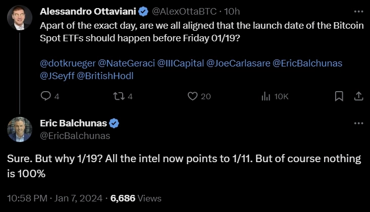 지난 7일(현지시간) 에릭 발츄나스(Eric Balchunas) 블룸버그 애널리스트는 자신의 X(옛 트위터)에 "현재 모든 정보는 1월 11일 이전에 비트코인 현물 ETF가 승인될 것을 가리키고 있다"며 "물론 100% 확실하다고 할 순 없다"고 덧붙였다.