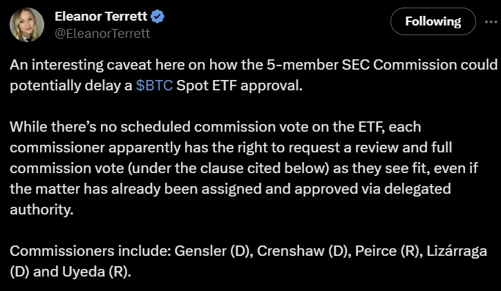 9일(현지시간) 엘리노어 테렛(Eleanor Terrett) 폭스비즈니스 기자는 자신의 X(옛 트위터)를 통해 "5인의 SEC 위원회는 비트코인 현물 ETF 승인을 지연시킬 수 있다"며 "이들의 ETF 투표 일정은 없으나, 각 위원은 필요시 검토 및 전체 위원회 투표를 요청할 수 있는 권한이 있다"고 전했다.