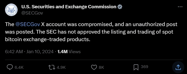 앞서 SEC 공식 X에는 "SEC에 등록된 모든 국내 증권 거래소에 상장할 수 비트코인 현물 ETF 출시를 승인했다"는 게시물이 올라왔다. 해당 게시물은 현재 삭제된 상태다.