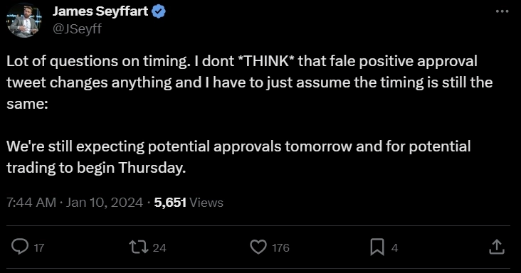 10일(현지시간) 제임스 세이파트 블룸버그 애널리스트는 X(옛 트위터)에 "승인 시점에 대한 질문이 많다. 나는 ETF 승인 게시물이 나온다고 해서 달라질 것이라고 생각하지 않으며, 시점은 여전히 동일하다고 생각한다"며 "우리는 여전히 내일 승인을 기대하고 있으며, 거래는 목요일에 시작될 것으로 예상하고 있다"고 말했다.