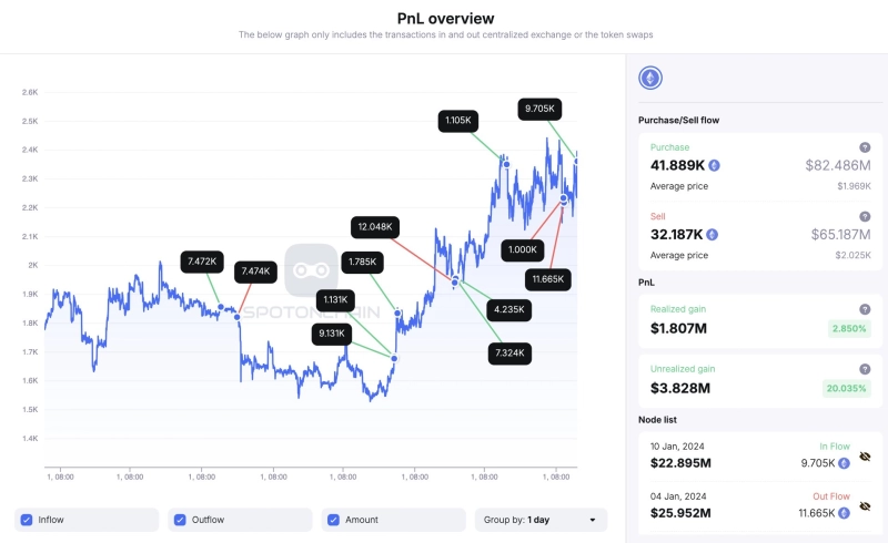 10일(현지시간) 스팟온체인에 따르면 이 고래는 지난 한 시간 동안 바이낸스에서 이더당 2359달러에 9705 ETH(약 229억달러)를 인출했다.